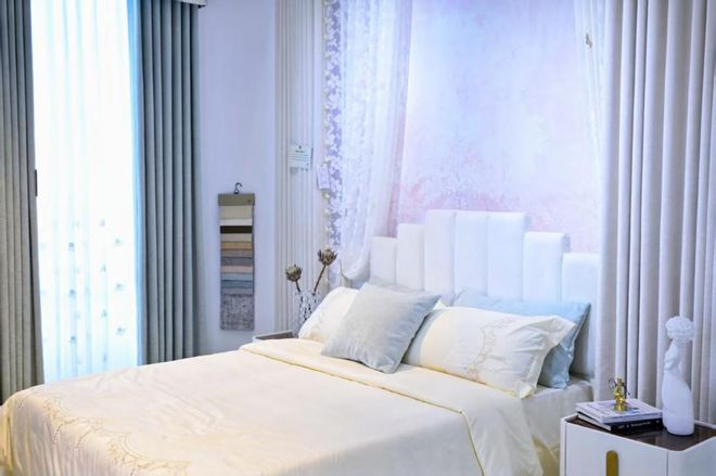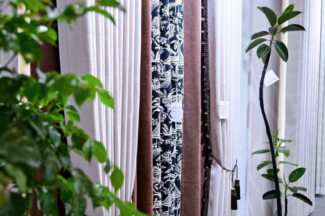 为参加此次展会,闻翔帘铺特别推出了5个设计师版本系列新品。其中,一款特别设计的窗帘大胆选用黑色系面料,搭配金色带细闪的纱线,在灯光下呈现出若隐若现的光泽感;窗帘下半部分则采用撞色拼接设计,并以白色小毛圈点缀,显著提升了产品的设计感。在强调设计美学的同时,闻翔帘铺也注重产品性能的突破性升级,展位上窗帘搭载的7A级抗菌功能,致力于为客户打造更洁净健康的居住环境。对于本次参展,闻翔帘铺业务部经理李虹黎表示:“此次窗帘展,我们在展位装修上有比较大的变化,通过窗帘成品、场景搭配,能够让客户更直观的看到成品展现效果。”